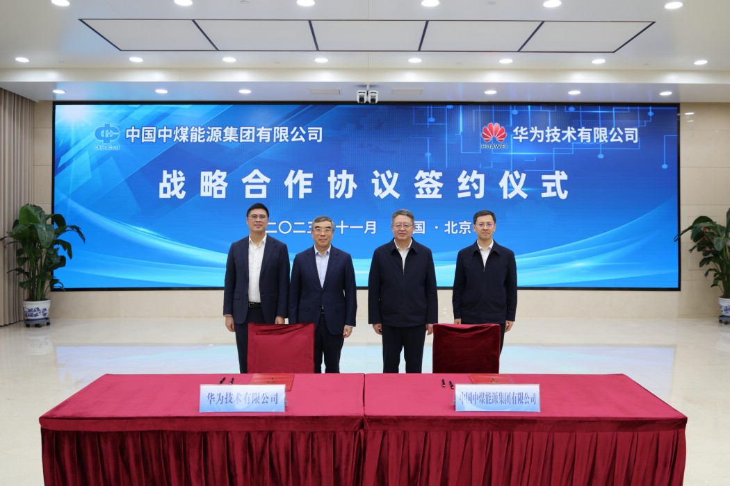 11月6日,中國中煤與華為簽署深化戰略合作協議。中國中煤黨委書記、董事長王樹東在集團公司總部會見華為董事長梁華并見證簽約。中國中煤黨委常委、副總經理倪嘉宇,華為油氣礦山軍團副總裁陳銀緒分別代表雙方簽署協議。